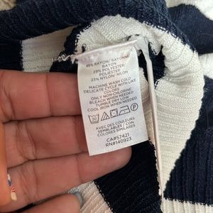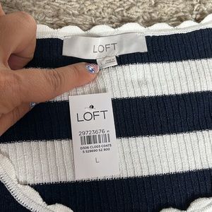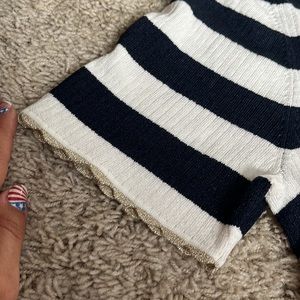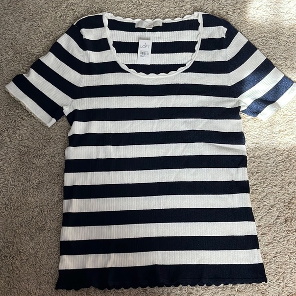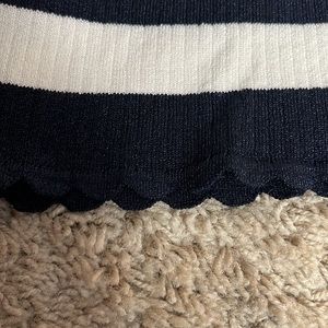 Striped navy blue and white scalloped top. Scalloped trim around the neck, arms, and the waist. Some stretch in the material clings to the bod by, very comfortable, only been tried on never worn.