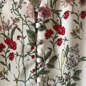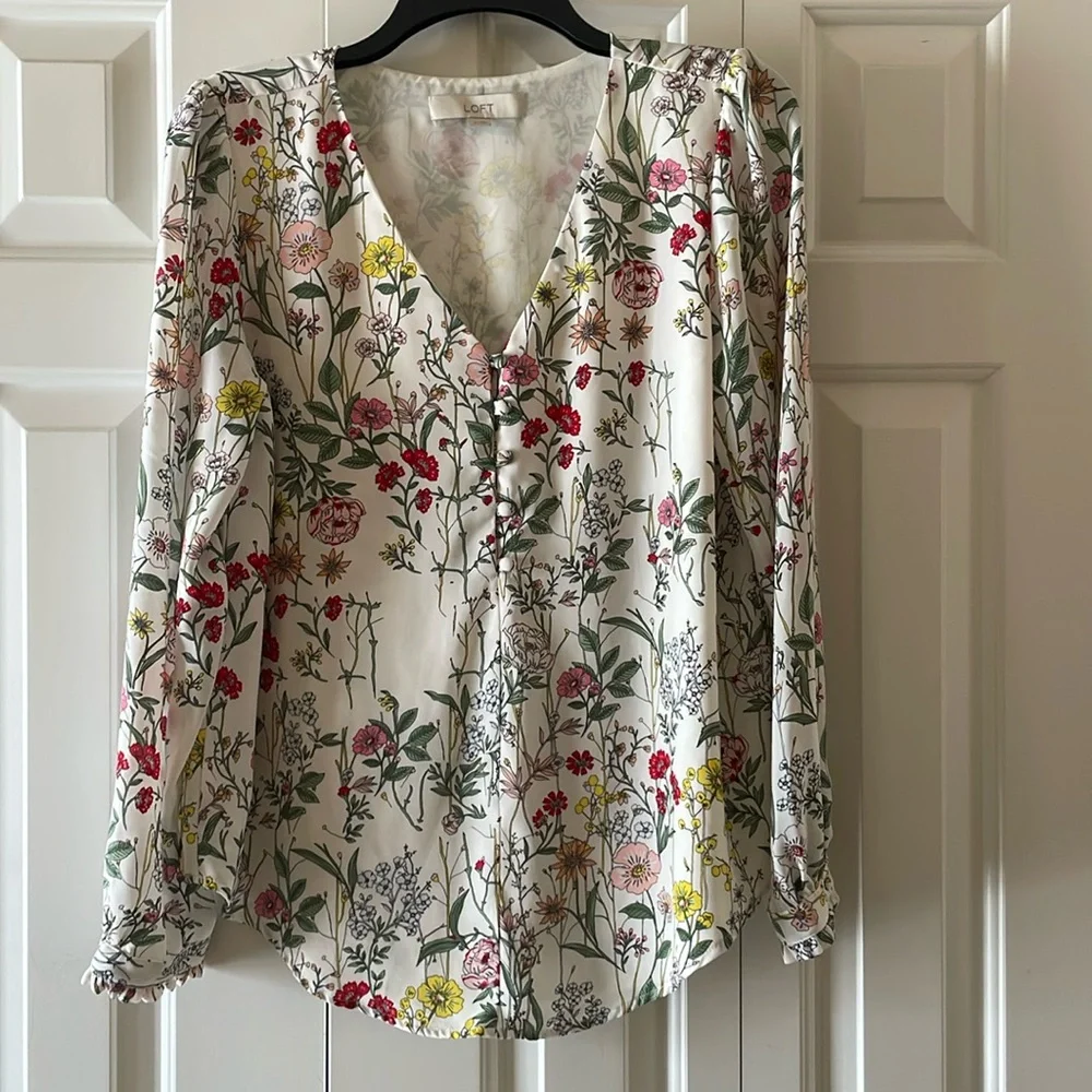 Women’s Loft Top. Size: M. Colors: white, pink, green, yellow, red, blush, and outlines are black. Cute top and very versatile! Top is fully lined with a white underlay (see photos).