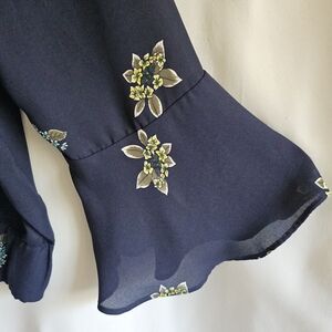 Loft navy blue floral top with bell sleeves and tie detail. V-neck and long sleeves. Size XL