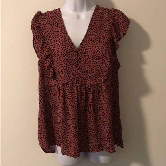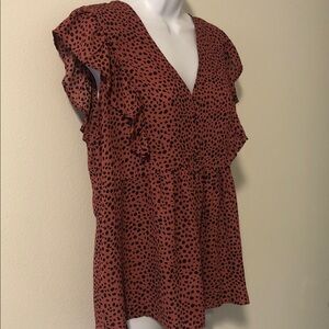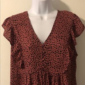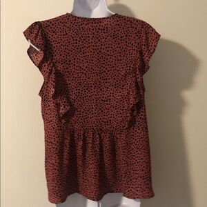 Rust with Black Dots Vee Neck. Featuring Flowy Ruffles to Sleeve and Front and Back. Covered Bottens opening to High Bodice Front. Flowy to Front and back. Great Used Condition.