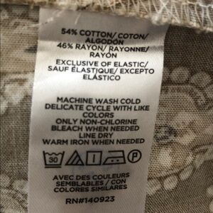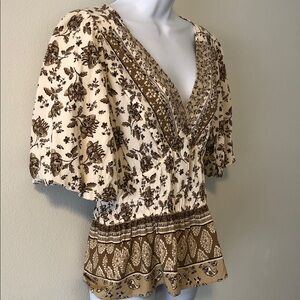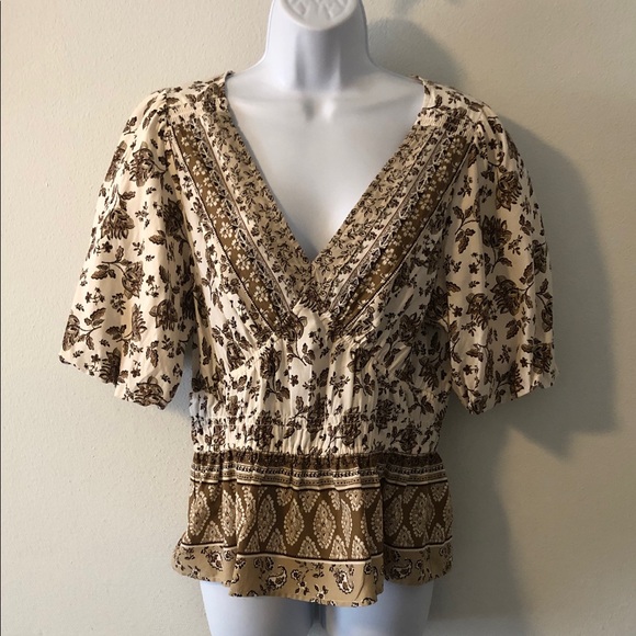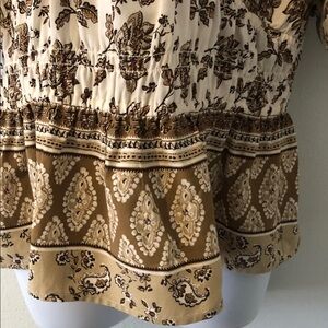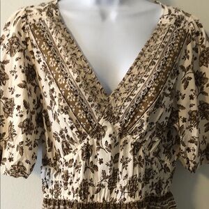 Boho Style Cream, Tan and Brown Print Peplum Crop Top. Elastic at Waist, Deep Vee Neckline. Short Balloon Lined Sleeves. Great Used Condition.