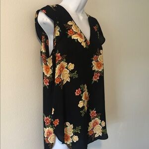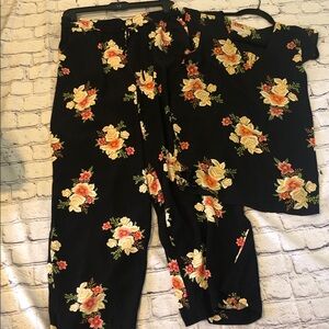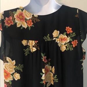 Black with Floral Pattern Vee Neck Top. Featuring fFlutter Ruffle Sleeves. Long Hi-lo Hemline. Great Used Condtion. Looks Great with Matching Pants. Sold Separately. Great Used Condition.
