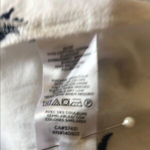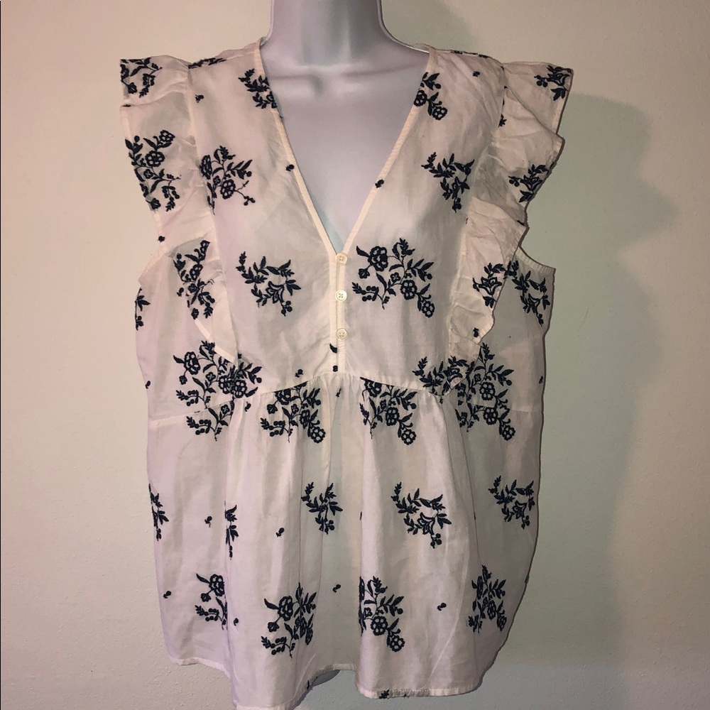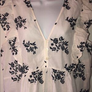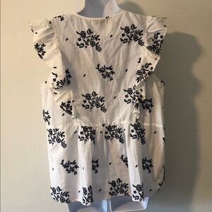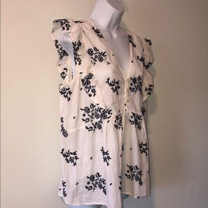 White with Navy Embroidered Print Sleeveless Top. Featuring Ruffles to front and back to High waist Flowy Top. Vee Neck with Buttons. Great Used Condition