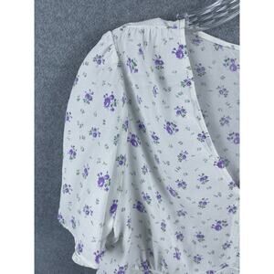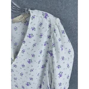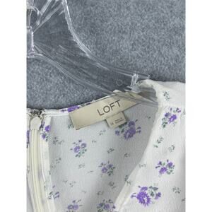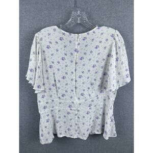 Loft Top Women's 14 White Purple Floral Print Short Sleeve V Neck Back Zipper