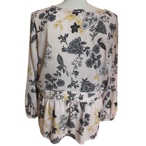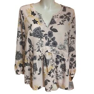 The Loft Womens Babydoll Top Plus Size 22 Lightweight Floral Long Sleeve Casual Pink is a relaxed fit tunic made of lightweight polyester. It has a V-neck, long sleeves with button accents, and a pullover closure