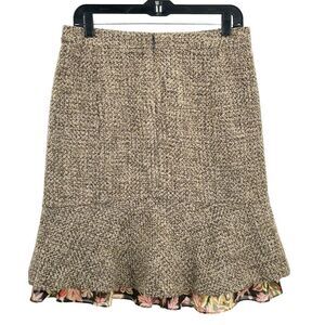 Loft Women Tweed Texture Flounce Skirt Brown Floral Hem Accent Size 8 Wool Blenf