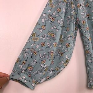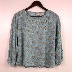 Loft Women’s Aqua Floral Print Mixed Blouse Size XS Blouson Sleeves