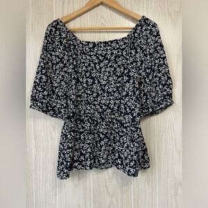 Loft Women's Blouse Large Navy White Floral Smocked Scoop Neck Short Sleeve NWT