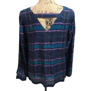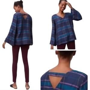 Loft Women's Blue and Purple Plaid Top with Bell Sleeves Size Small Medium New
