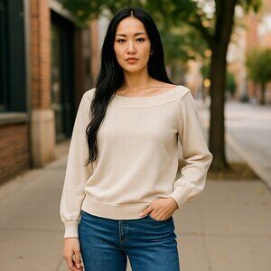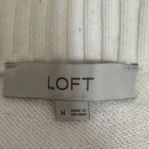 This Loft sweater offers a refined touch to your wardrobe with its off-shoulder design and neutral cream tone. Made from a comfortable cotton blend, it is both stylish and versatile, suitable for various professional settings or casual outings. The sweater pairs well with jeans or skirts, making it a versatile addition.