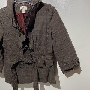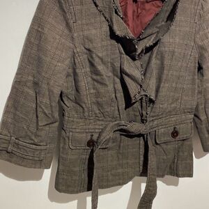 Loft Women's Brown Plaid Belted Ruffled Neck Tweed Blazer Jacket Size 4P
