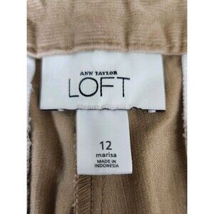 These Loft Women's Camel Corduroy Pants in size 12 feature a boot cut and are designed by Marisa Ann Taylor. The pants are made of a comfortable blend of spandex and cotton corduroy fabric, with a mid rise and a wide leg style. They have a zipper closure, pockets, and a solid Camel brown color, making them a versatile and stylish choice for casual occasions during the winter, fall, and spring seasons. Machine washable and with a flat front design, these pants offer a preppy and sophisticated look for any woman's wardrobe.