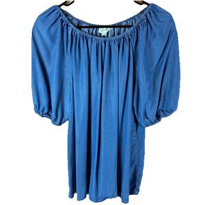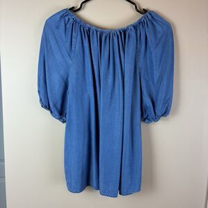 The Loft Women's Denim Look Balloon Sleeve Boho Top in size medium is a stylish and versatile blouse for women. Made from lyocell fabric with a denim texture, it features a flattering round neckline, short balloon sleeves, and a solid blue color.