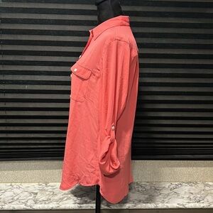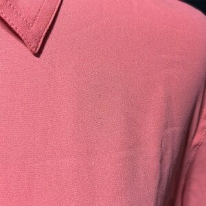 Loft women’s everyday long sleeve button front collared shirt. Salmon pink. Roll cuff sleeves. 100% polyester. Couple small spots on shoulder as shown in pic. Size Medium
