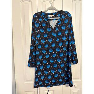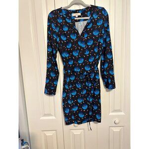 This Loft dress showcases a sophisticated floral print in a striking blue against a deep black backdrop. Its long sleeves and belted waist provide a tailored fit, enhancing the silhouette while ensuring comfort. A versatile addition to any wardrobe, suitable for both professional settings and casual gatherings.