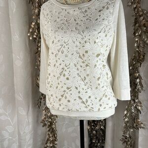 Elegant ivory pullover from Loft with a floral lace front overlay and soft knit back. Features 3/4 sleeves and ribbed trim for a stylish yet comfy look. Perfect for layering or stand-alone wear.