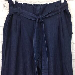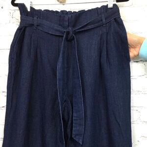 NWT Loft Women's Paper Bag Waist Dark Wash Blue Cotton Linen Belted Straight Leg Pant Size Large