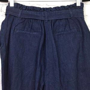Loft Women's Paper Bag Dark Wash Blue Cotton Linen Belted Straight Leg Pant L
