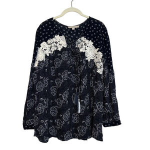 Loft Women's Peasant Blouse Large Navy White Floral Shoelace Neckline Tasseled Cottagecore Boho