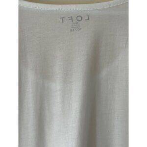 This Loft women's plus-size white T-shirt is a wardrobe essential. Crafted from a soft cotton blend, it offers comfort and a relaxed fit. The short sleeves and scoop neckline provide a flattering silhouette. Perfect for layering or wearing on its own, this versatile piece seamlessly blends style with everyday practicality.