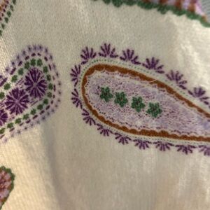 This sweater has a V neck. It is cream based with a purple,green & brown pasley design.