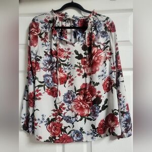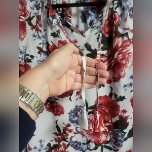 Loft Women's - Red and Blue Floral Tie Neck Blouse Size S