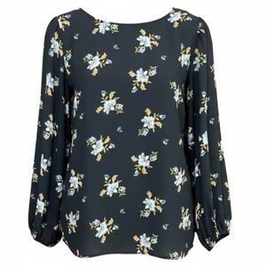 Loft Women's Size L Blouse Top Long Sleeve Blue Floral Polyester Crew Neck
