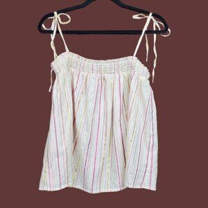 Loft multicolor metallic striped shoulder tie top in ivory, pink, silver, gold, and copper. Elastic smock neckline. Shoulder tie straps. No stains or holes. Casual spring summer colorful metallic top.