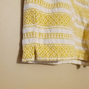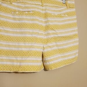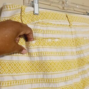 Women's yellow gold and white printed Riviera shorts by Loft, size 14. 100% cotton. Shorts have a mixed print design of stripes and southwestern print. Front slant pockets, back pockets and zipper/clasp closure. Small splits on sides. Excellent pre-owned condition; no flaws.