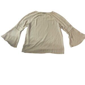 The Loft women's cream long sleeve blouse in size L is a classic and versatile piece made in India. This solid ivory blouse features a round neck, wide straps, and bell sleeves, making it perfect for various occasions such as travel, casual outings, or business meetings. Made from lightweight polyester and rayon fabric, this blouse is easy to care for with a pull-over closure and should be dry cleaned only. The timeless design and comfortable fit make it a wardrobe staple for the summer, fall, and spring seasons.