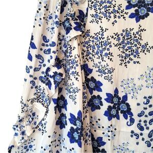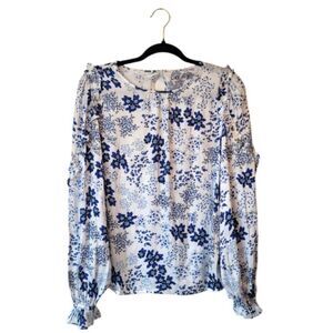 Loft Women's White And Blue Ruffle Sleeve Blouse Size M NWT