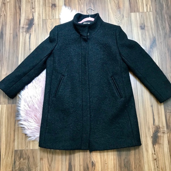 I love this coat just own to many. Only worn maybe 5 times It’s a boiled wool texture. Has a front zip closure, and two snap closure collar for warmth. It’s fully lined and fits very nice and looks elegant. As with any black coat it collects fibers. Nothing a lint roller can’t remove. Measurements are: Chest 23”, Length 36”, Arm length 24”. Super flattering on and keeps you nice and warm.