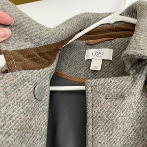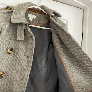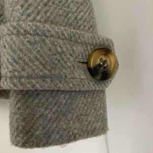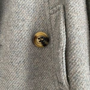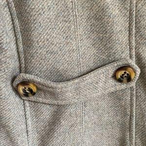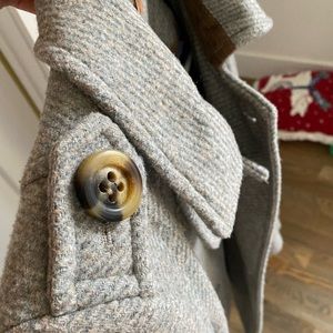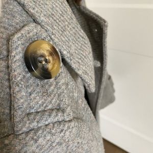 Gray jacket with large buttons, comes to top of hips, lightly worn, cute box pockets, button detail on back