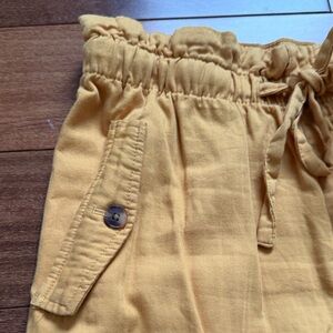Comfortable yellow drawstring pants with buttoned pockets. Paper bag top. Definitely more of a mustard yellow then the pictures show.
