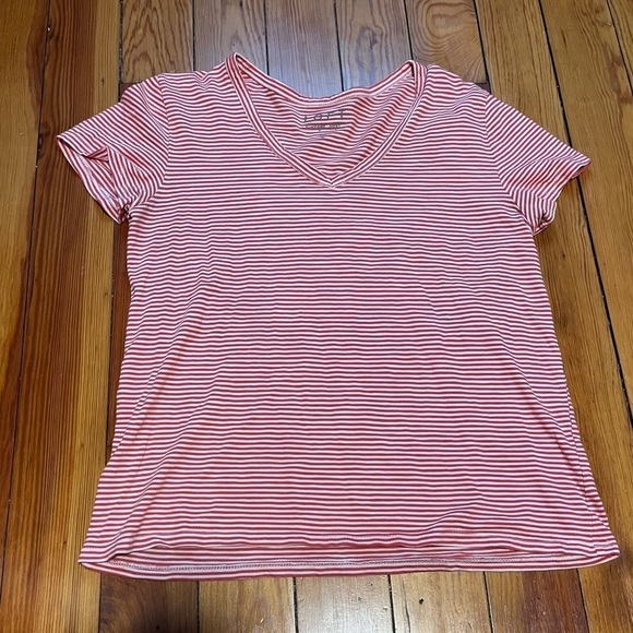“Vintage soft” basic v neck tee. White and coral/dark pink stripes. 100% cotton. Good used condition.