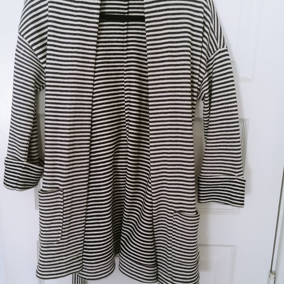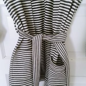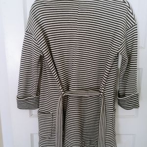 This jackets is a cream and black stripe with removable belt, pockets and large cuff 3/4 sleeves