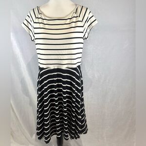 This dress is a classic black and white stripe dress and looks amazing adding a red belt for a pop of color! Soft material and flowy skirt. EUC