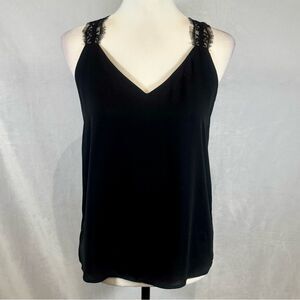 Beautiful lace detail on the straps and back of this vneck cami top. Runs a little big and could fit up to a small. EUC