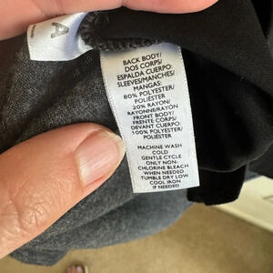 Loose and long top with long sleeves and v-neck. Back is stretchy knit. Slight high low. Made with polyester and rayon.