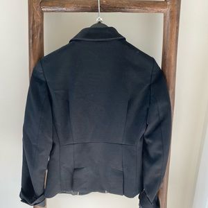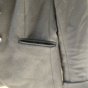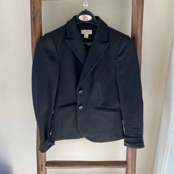 Black blazer, Loft. Satin liner with light pink detail. Pockets in from and double slit in back.