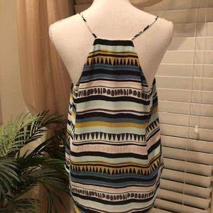 Loft blouse with spaghetti straps in multi color (aqua, blue, yellow) lines and different shapes. Length from bust to hem is 18 inches. 100% polyester