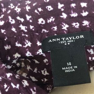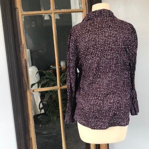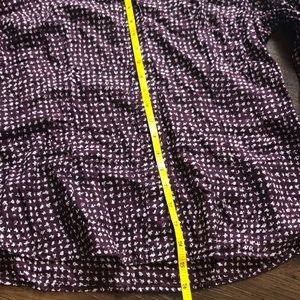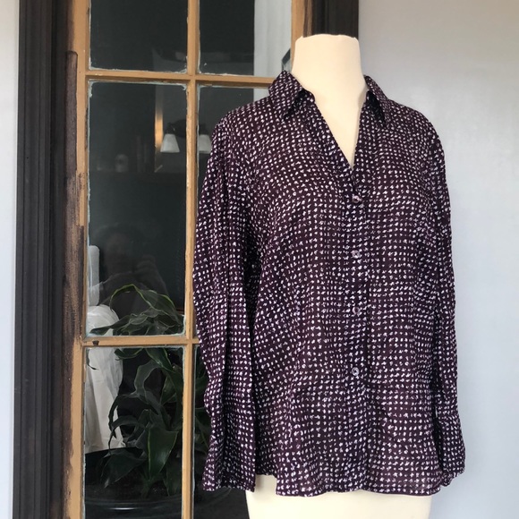 Burgundy blouse with white pattern design. Super soft, great thin fabric for summer. Definitely not a size 14, more like a small or medium fit. GUC although small. From a pet and smoke free home.
