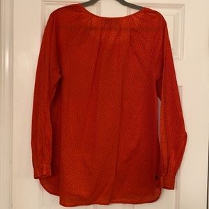 Coral with blue tiny polka dots. Button down cotton rayon blend.