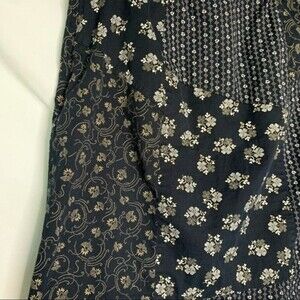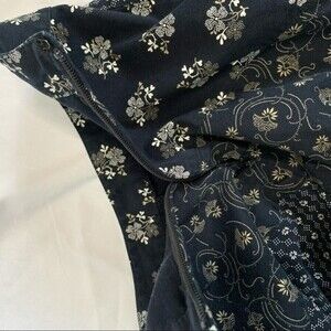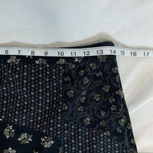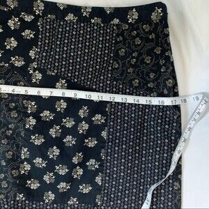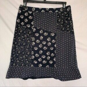 Size 6p skirt. Patch work floral With Dark blue and beige colors. It has a Hidden side zipper closure and a fluted or ruffle hem.