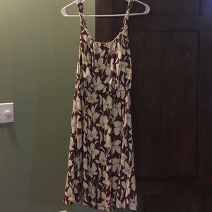 Dress has thicker twisted spaghetti straps. Colors are mauve, black, cream, and mustard yellow. The cable knit shrug is the same mauve color as in the floral design on the dress. Beautiful set in like new condition.