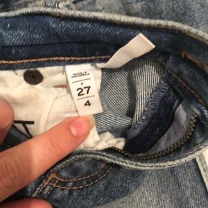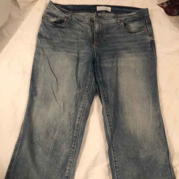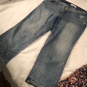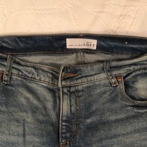 Loft jeans. Size 4, but fit more like a 6. Nice light wash. They are long capris. I am 5’3” and they sit just a couple inches above my ankle.