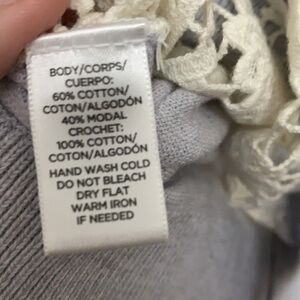 Size small. Gray sweater with crochet front. 60 cotton/ 40% modal. Excellent like new condition.
