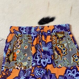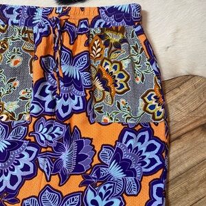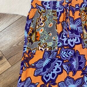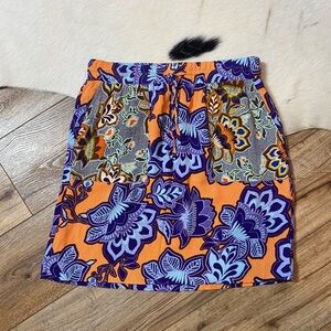 It features a vibrant floral design in shades of orange, purple, blue, and black. The skirt appears to have an elastic waistband with a drawstring. Open to offers and bundle items to save!