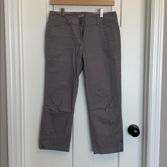 Gray khaki cropped capris with button detailing at bottom