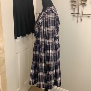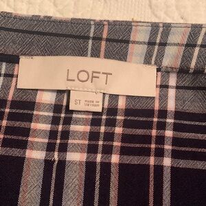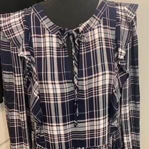 Loft dress long sleeves with ruffle wrist ruffles on bodice front and back tie at neck . Gathered waist. Great with flats or boots like new -hand wash- rayon 19.5 pit measure 36” length size Small T which means it’s a little longer . I like a little more length.😄